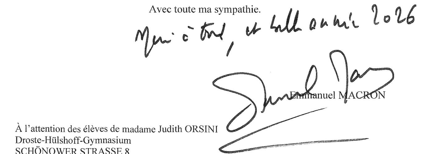 Die Schüler:innen des Französisch-Leistungskurses der 12. Klasse von Frau Orsini haben eine Anerkennung des französischen Präsidenten Emmanuel Macron in Form eines persönlichen Briefes erhalten.